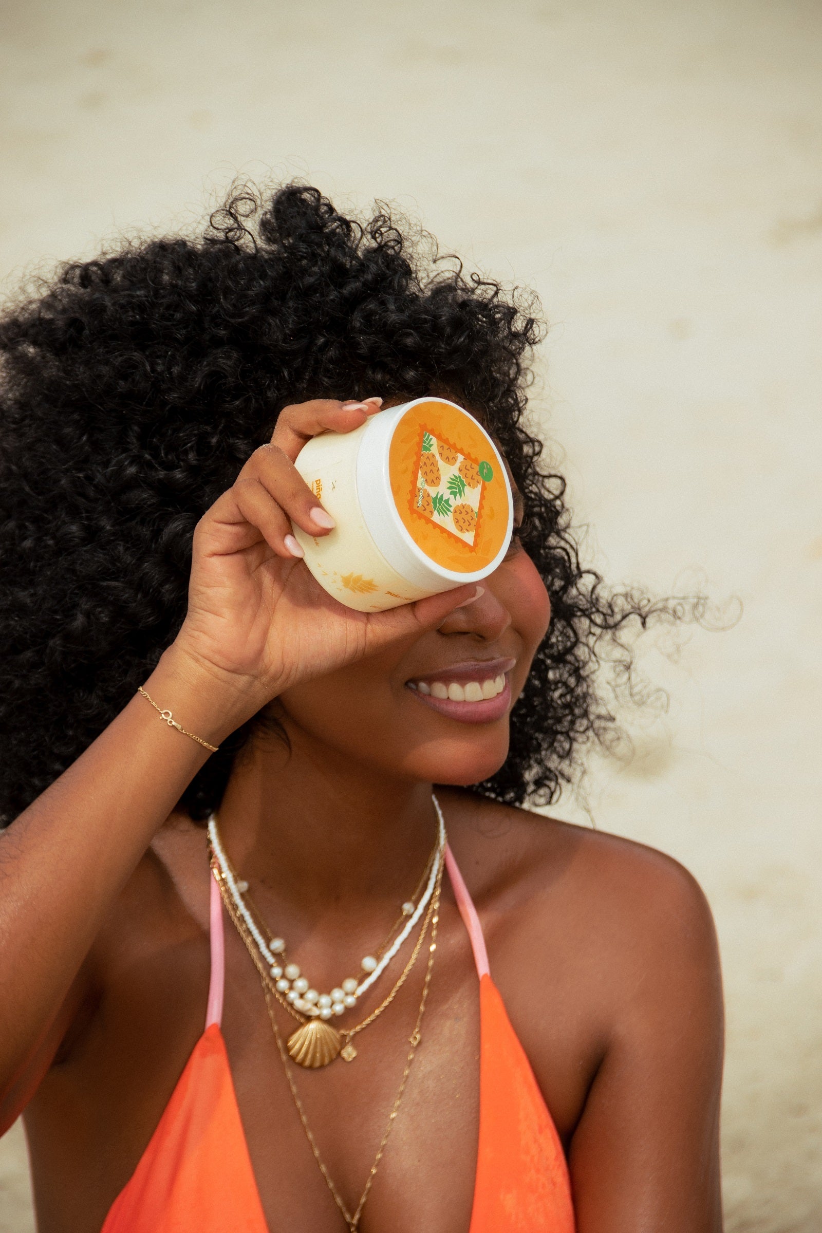 Piel que brilla, suavidad que perdura. El calor del sol hecho caricia. Una carta de amor a tubelleza natural. Nuestra Mantequilla Corporal Palo e’ Sol se funde en tu piel con ingredientes nutritivos comoel Aceite de Coco, la Vitamina E y la Manteca de Cacao. Hidrata profundamente, mejora la elasticidad y deja un acabado sedoso que enamora. Todo envuelto en una fragancia tropical de piña colada, que te transporta a un rincón del paraíso con cada aplicación. Radiante, envolvente y con olor a eterno verano.