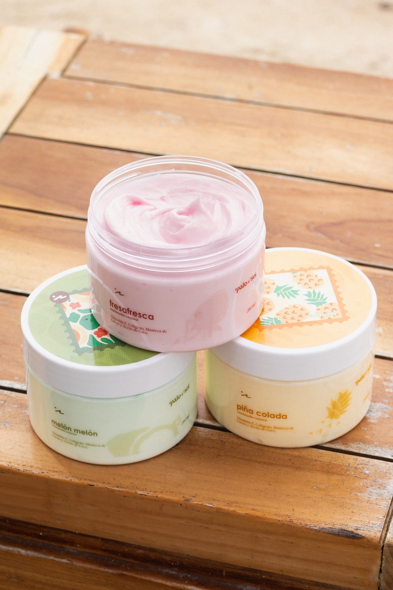 Piel que brilla, suavidad que perdura. El calor del sol hecho caricia. Una carta de amor a tu belleza natural. Nuestra Mantequilla Corporal Palo e’ sol se funde en tu piel con ingredientes nutritivos como el Aceite de Coco, la Vitamina E y la Manteca de Cacao. Hidrata profundamente, mejora la elasticidad y deja un acabado sedoso que enamora. Todo envuelto en una fragancia fresca y jugosa de fresa que despierta los sentidos. Radiante. Suave. Irresistible.